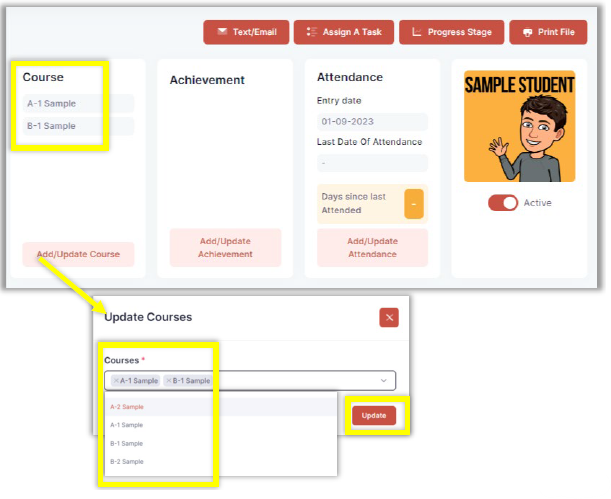 To assign or change a course for a student, click Add/Update Course under the Course section of the Student Details screen. Select the desired course from the dropdown options. Courses can also be removed by clicking the X next to the course you’d like to remove. Click the Update button to save changes. The course will then appear in the Course section of the Student Details screen.